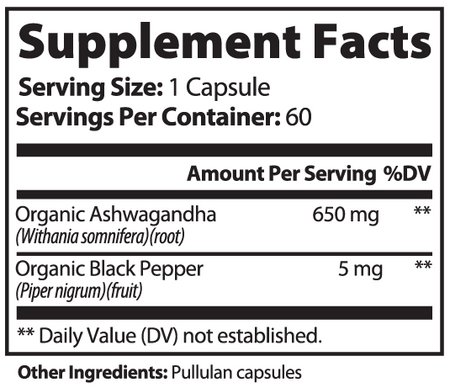 Ingredients: Organic Ashwagandha (Withania somnifera)(root), Organic Black Pepper (Piper nigrum)(fruit), pullulan capsules.